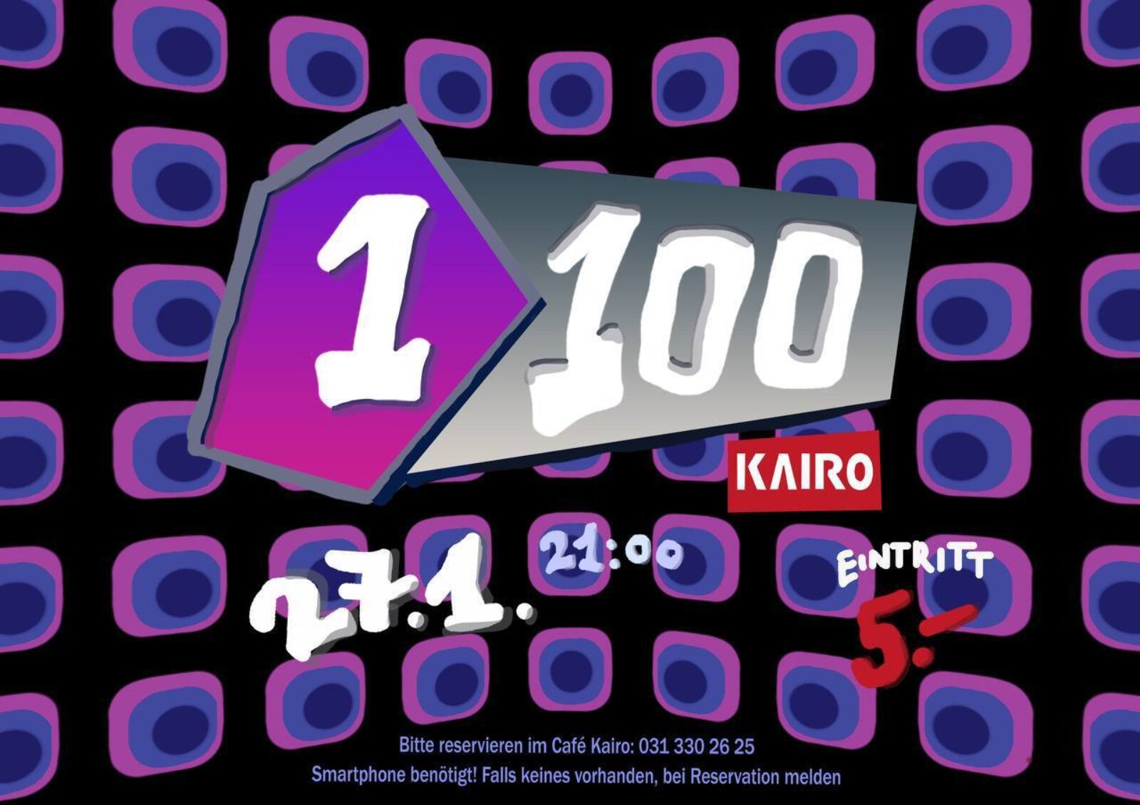 Lustige Quizshow im Stil von 1 gegen 100 am 27.1. im Kairo-Keller. Die perfekte Gelegenheit dein Allgemein- und Spezialwissen zu testen und mit etwas Glück grossartige Preise zu gewinnen. Bitte im voraus reservieren unter 031 330 26 25 und Smartphone mitnehmen. Wir freuen uns!