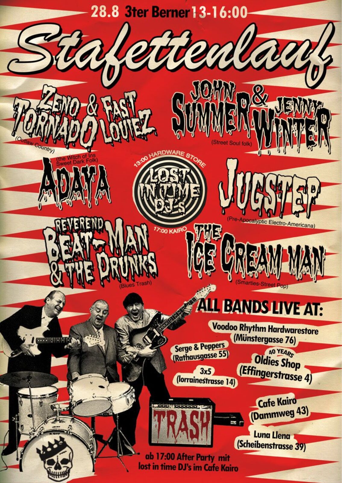Aaron ist ein Amerikanischer Strassen Blues Folk Musiker der hier mit seinem Neuen Duo JUGSTEP Pre-Apocalyptic Electro-Americana auf die Gasse Bringt, als nächstes ist Adaya zu zweit unterwegs, sie spielt bitter Süssen Folk Pop ,Reverend Beat-Man kommt mit seinem Trio the Drunks und macht Primitiven Rock’n’Roll Trash mit Handorgel und Gesangs-Rohr, der Umtriebige Maze von Tomazobi spielt mit seiner One Man Band the Ice Cream man mit dem er jeden hit zum schmelzen bringt, Zeno Tornado & Fast Louiez sind Stadt bekannte raufbolde und ungehobelte Country Folk sänger die kein blatt vor den mund nehmen, und als Creme de la creme von der Berner Musik Scene haben wir Housi Wittlin Gründer der 60’er Jahre legenden the Black Caps und bekannt als wohl erster Berner Strassen Musiker (im rock Bereich.. nicht Ländler) überhaupt!!! .. hier zum ersten mal mit seiner atemberaubenden Tochter Jennifer sie treten unter dem nahmen John Summer & Jenny Winter auf die konterte beginnen jeweils um 13:00 und gehen bis 16:30 … um 17:00 haben wir noch ein Abschlussfest im Cafe Kairo mit den DJ’s Lost in Time (rock’n’roll, Trash, Garage, Beat, SKA etc)