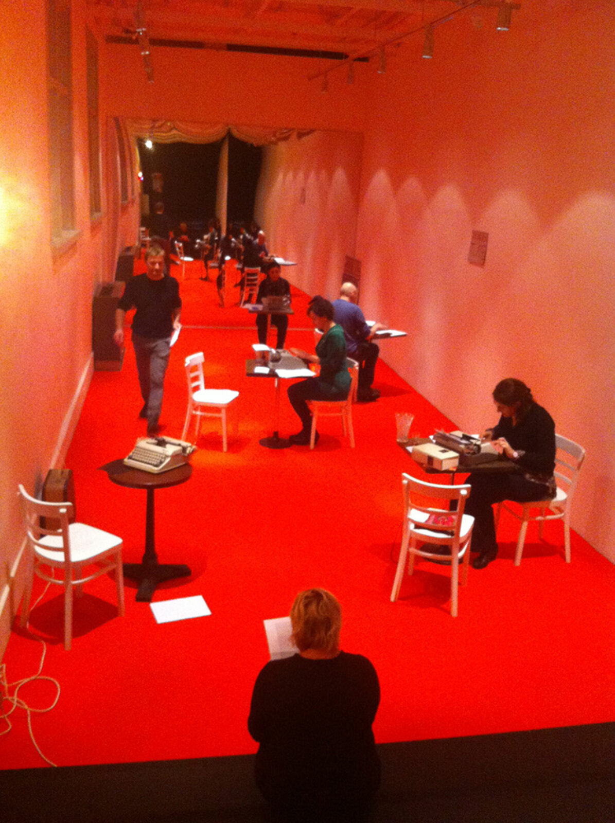 Es werden schreiben an den Schreibmaschinen: Karin Ley, Saskia Winkelmann, Maruan Paschen, Ivona Brdjanovic, Sarah Elena Müller, Melanie Katz, Anais Meier, Geneva Moser, Gianna Molinari und Julia Weber