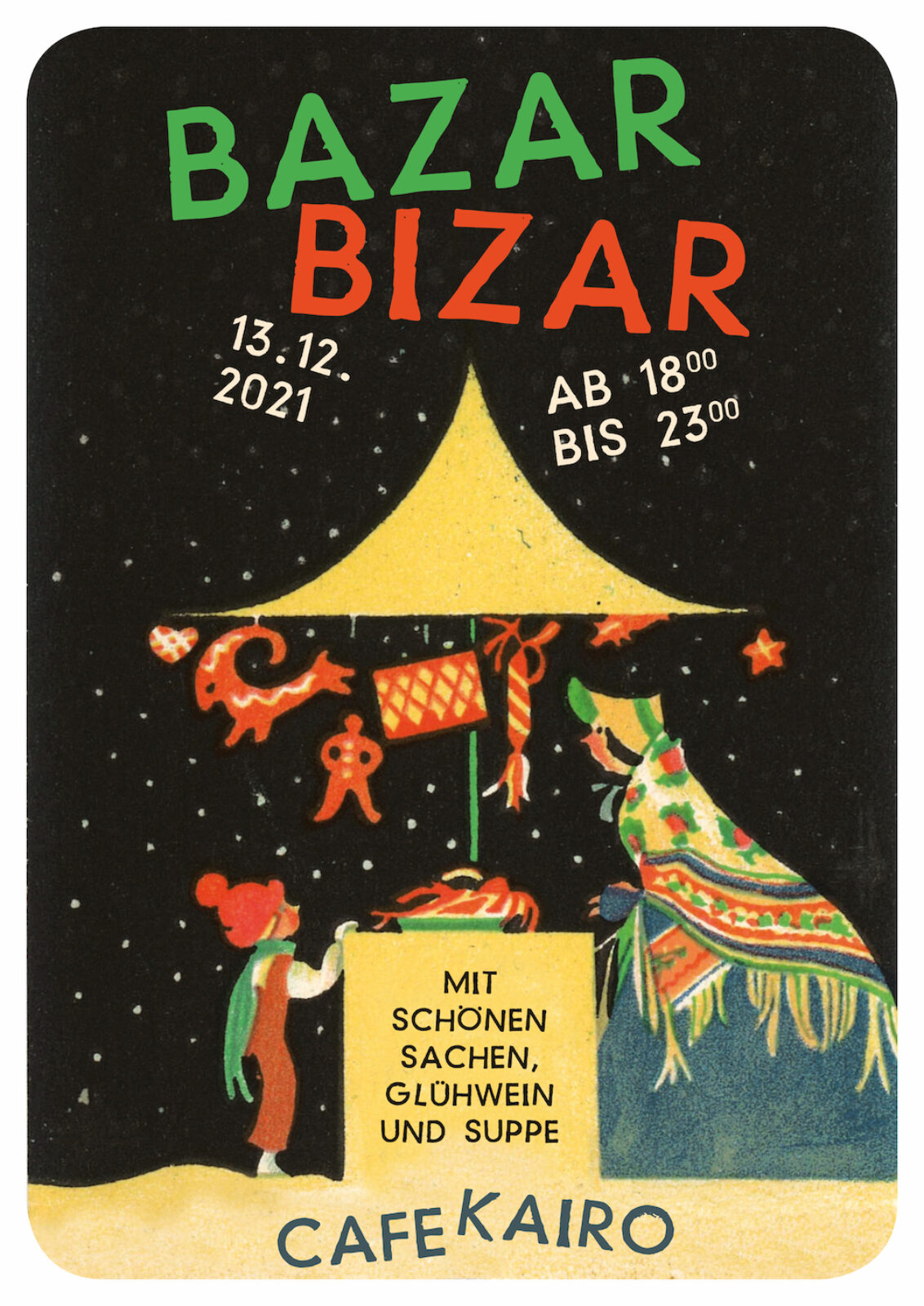Im und ums Café Kairo herum verkaufen Künstler, Handwerkerinnen und auch sonst allergattig Leute schöne Sachen. Ohne Christkindl und Kitsch, dafür mit schönen Kunst-Ständen. Wer hier kein Weinachtsgeschenk findet, ist selber eins.