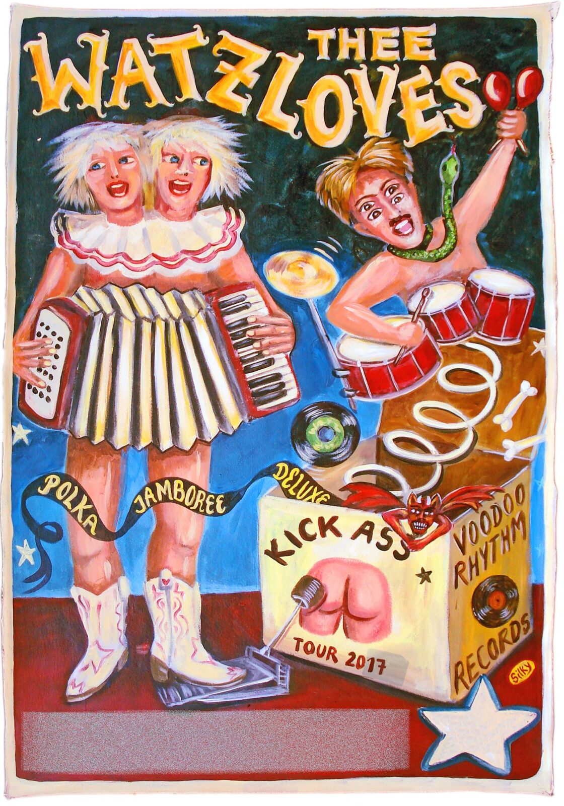 Silky spielt ihr Akkordeon eher weniger in der östlichen Polka-Tradition. Ihr Spiel ist vielmehr von Hillbilly und Zydeco (Schwarze Akkordeonmusik aus Louisiana und Texas) geprägt. Es wird hingebungsvoll auf den Bassknöpfen gerockt bis kein Fuss im Saal mehr stillsteht. «Silky has a clean, strong and pure voice that can do practically anything…» vom Herz-Schmerz Reisser bis zur Punk Rock Röhre. Guido singt die zweite Stimme und treibt mit seinem percussiven Schlagzeugstil auf Kuhglocken, Woodblock, Tambourine, Hi-Hat, Toms, Blechkannen etc. so manchen Song bis zur Explosion. Einige Maracas sind dabei schon geplatzt doch Thee Watzloves können auch anders: TRIO’s Coverversion «Energie» mit 80er Casio-Keyboard und Ukulele oder ruhige, herzzerreissende Stücke wie «Don’t Leave Me Lonely» , die selbst den härtesten Rock’a‘billy zum Weinen bringen.